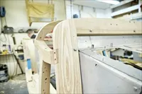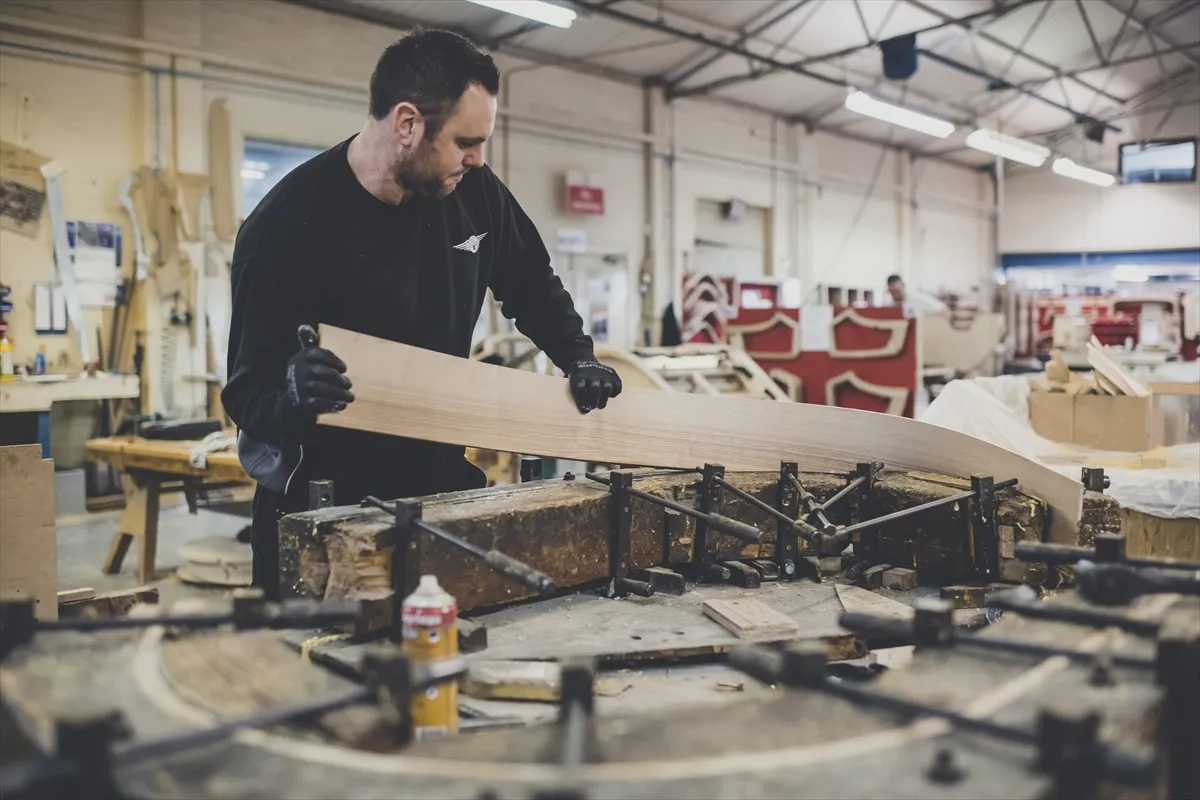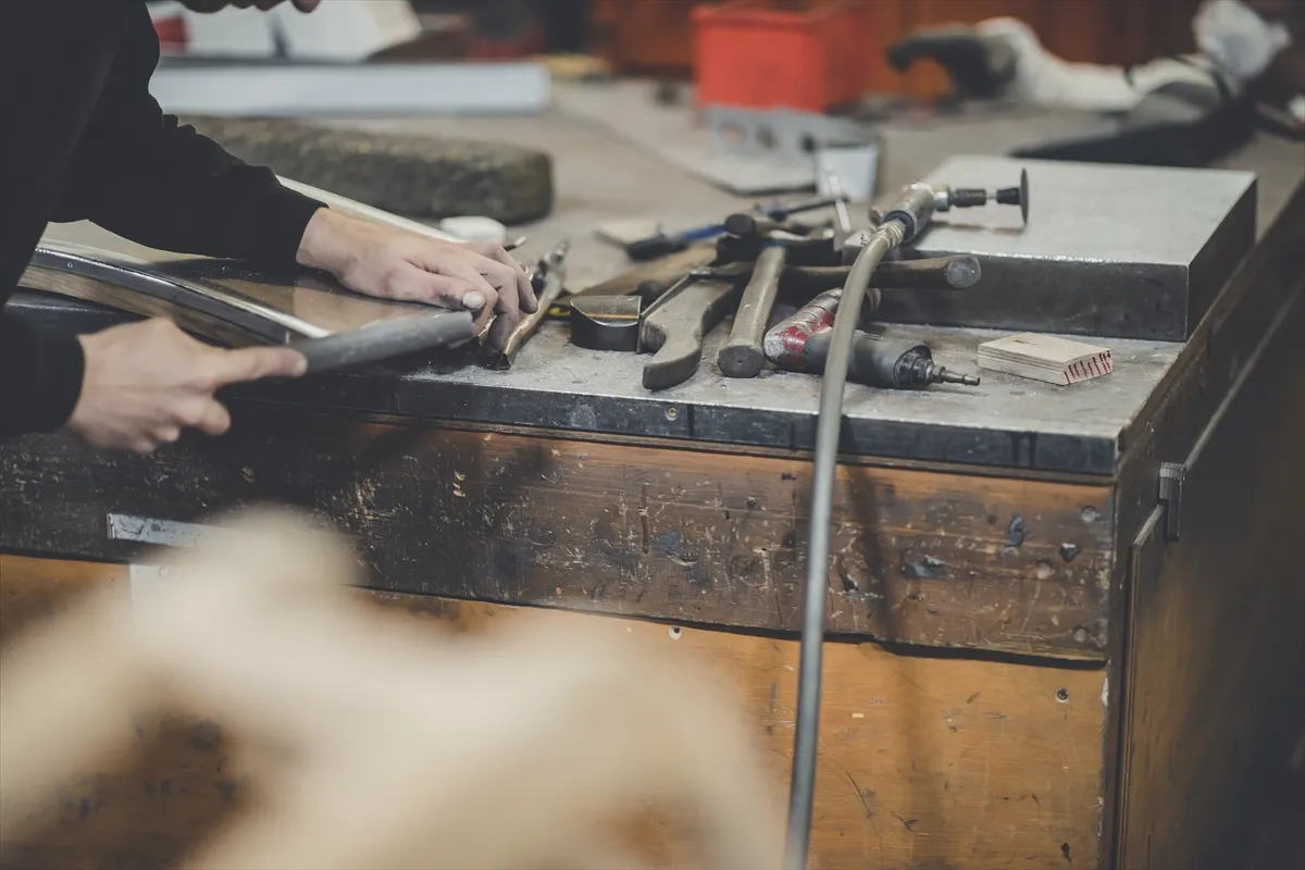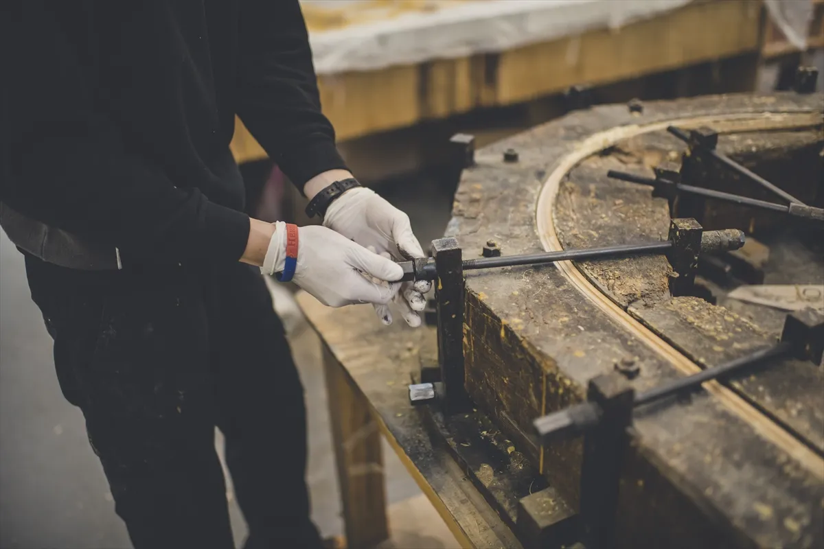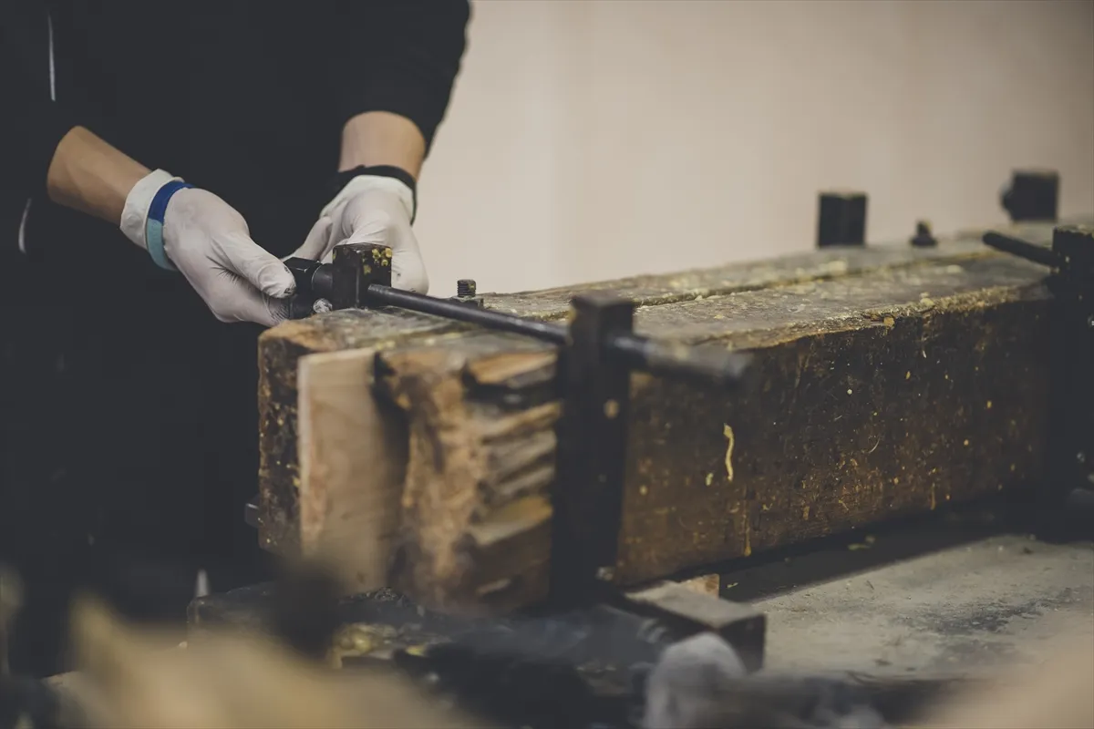 特に目を引くのは、木製パーツ部門です。ここでは、熟練の職人たちが木材を一つ一つ丁寧に加工し、サンドペーパーで削り、何度も「ちり合わせ」と呼ばれる微調整を繰り返します。その光景は、まさに伝統工芸品が生まれる瞬間を見ているかのようです。長年の歴史を物語るかのような年季の入った巨大なツールが、フェンダー用の木製パネルを丹念に形作っていく様子は圧巻の一言。