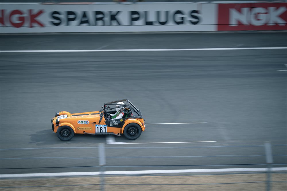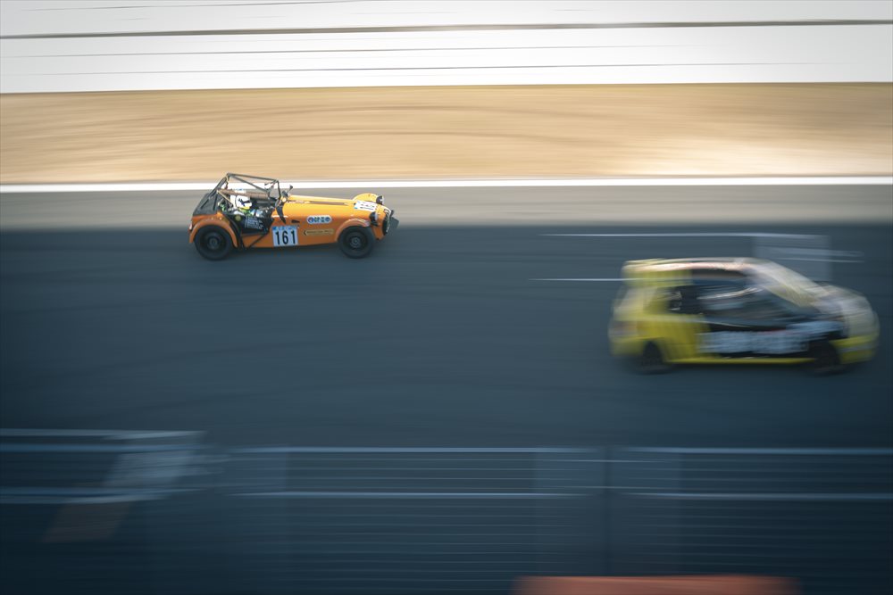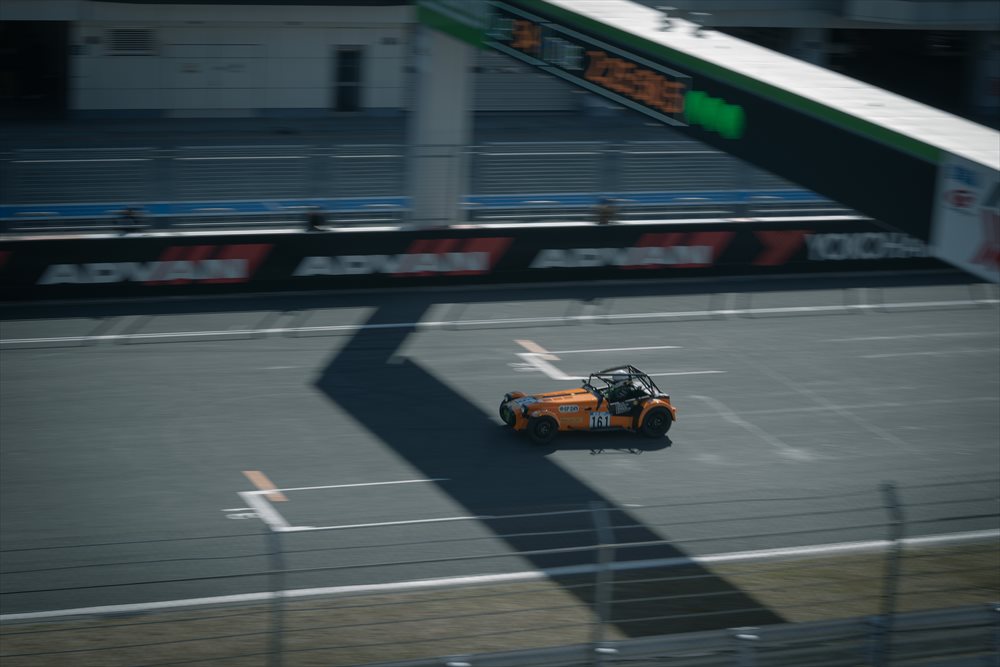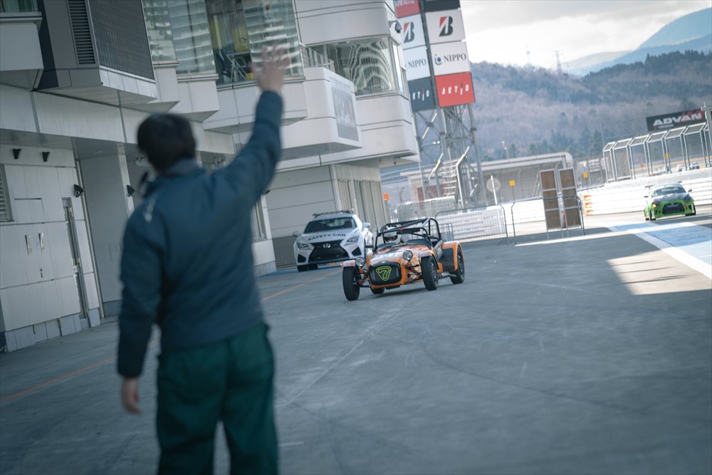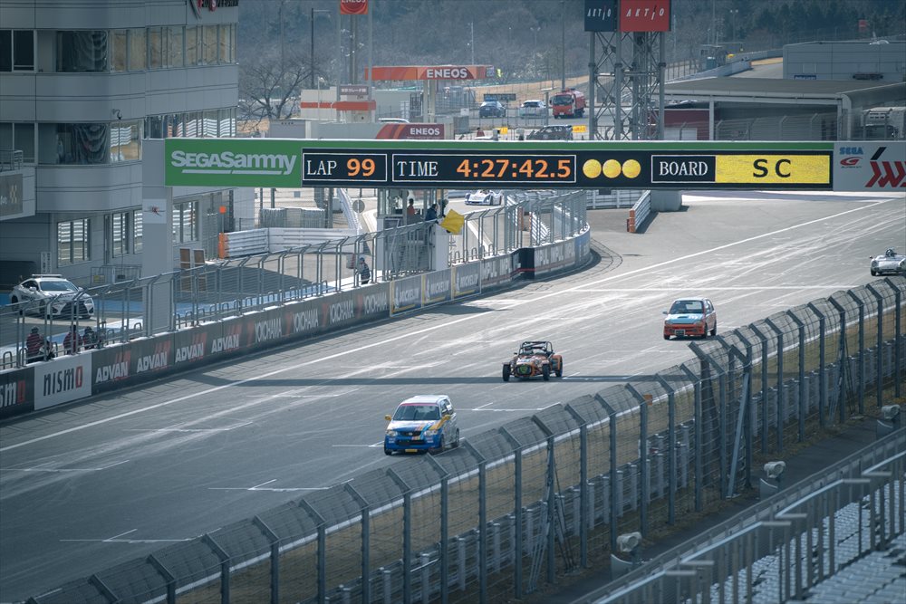 プライベートではSEVEN 620Rをドライブする栗山氏は、2度目とは思えない驚くほど安定走りで周回を重ねていきます。 97週目、コース上落下物でイエローフラッグ。昨年は度重なるイエローフラッグの荒れた展開でしたが、今年は実に順調です。