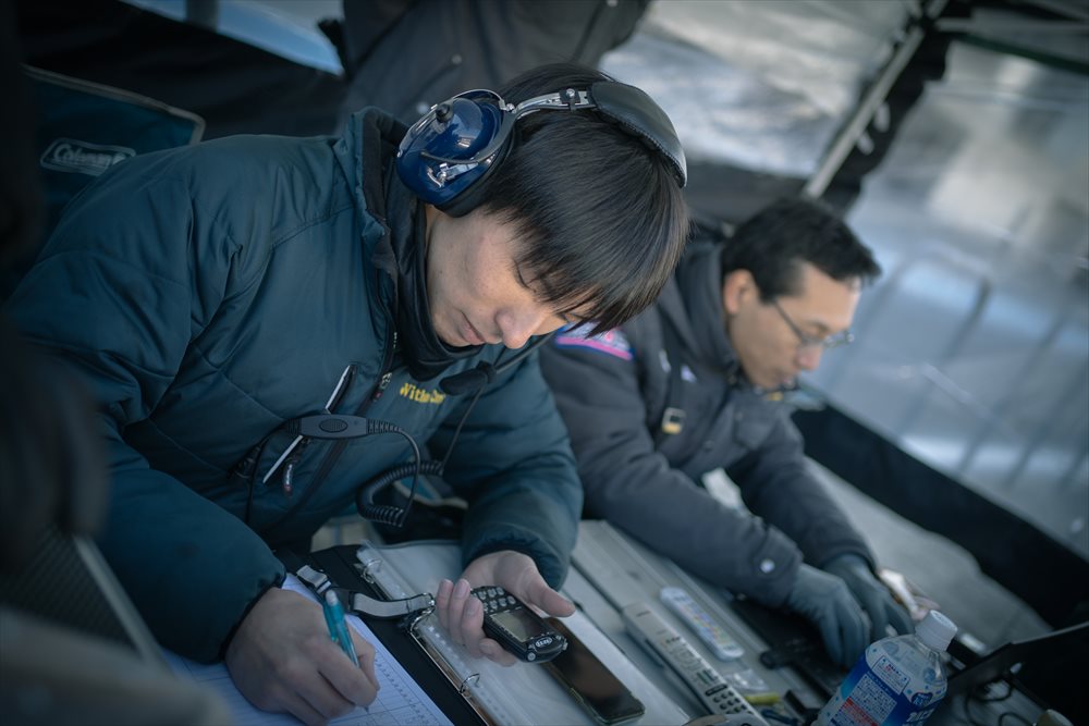 サインエリアに張り付くチーフメカニック内藤には、ドライバーから無線で燃料計が示す残燃料・コース上のトラフィックが伝えられます。 ドライバーからの情報と蓄積したデータからリアルタイムで燃費と走行可能距離を計算し、ペース配分や給油のタイミングをドライバーに指示するのです。 内藤の横ではテクニカルエンジニアの武田氏が、ラップタイムの記録や給油所の混雑具合の確認などによりチームをサポートします。