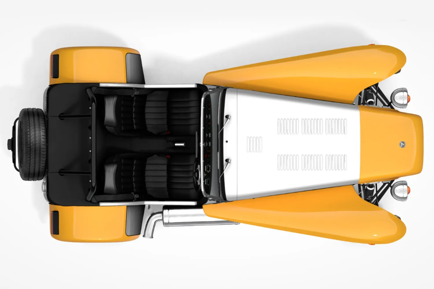 まず目を引くのはフレアードフロントウィングとリアキャリア付きスペアホイールを中心としたレトロフィットなエクステリア。1970年代から80年代のスーパーセブンをほうふつとさせる、ヘリテージモデルらしい出で立ちです。また、14インチのClassicホイール、Avon ZT7タイヤ、クロームフィラーキャップ、ブラックレザーのMoto-Litaステアリングホイール、カーペット付きリアパネル、ポリッシュドエキゾースト、LEDリアライトが標準設定されています。