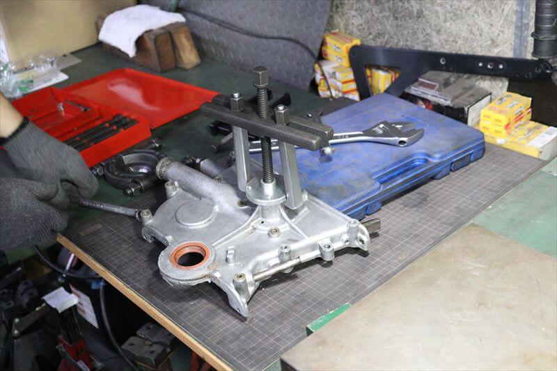 今回のELANに搭載されているエンジンはLOTUS TWINCAMの中でも前期タイプになり腰下からオイルが漏れやすい為、オイル漏れ対策と予防整備としてウォーターポンプの交換を実施します。