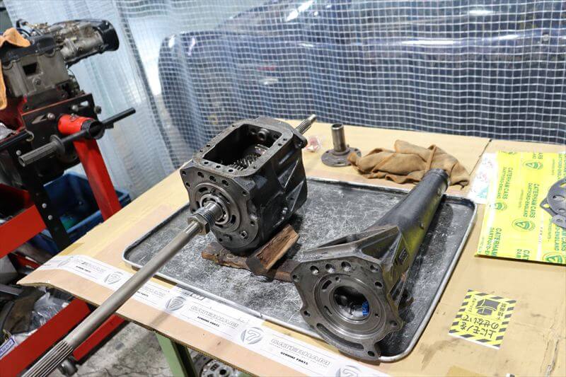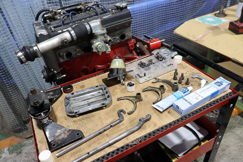 作業を進める中でオーナー様からのヒアリングで、ワインディングを走行時にシフト抜けが稀にあるとの事を聞き、せっかくなのでミッションの状態確認も同時に行わせていただきました。シンクロやギヤに摩耗はあまり見受けられく状態も良かった為、本体を分解することなくシフト抜けが起きるギヤのセレクターフォークとプランジャーボール及びテンションスプリングを交換を致しました。