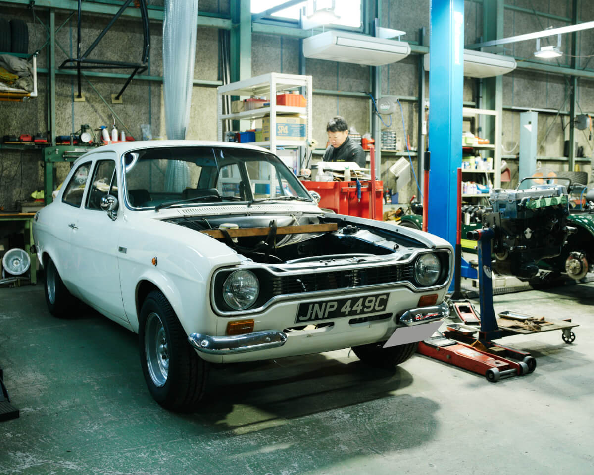 このホワイトのESCORTはLOTUS製のTWIN CAMエンジンを搭載したホットモデル。かつてはサーキットやラリーで数多く使用されていました。