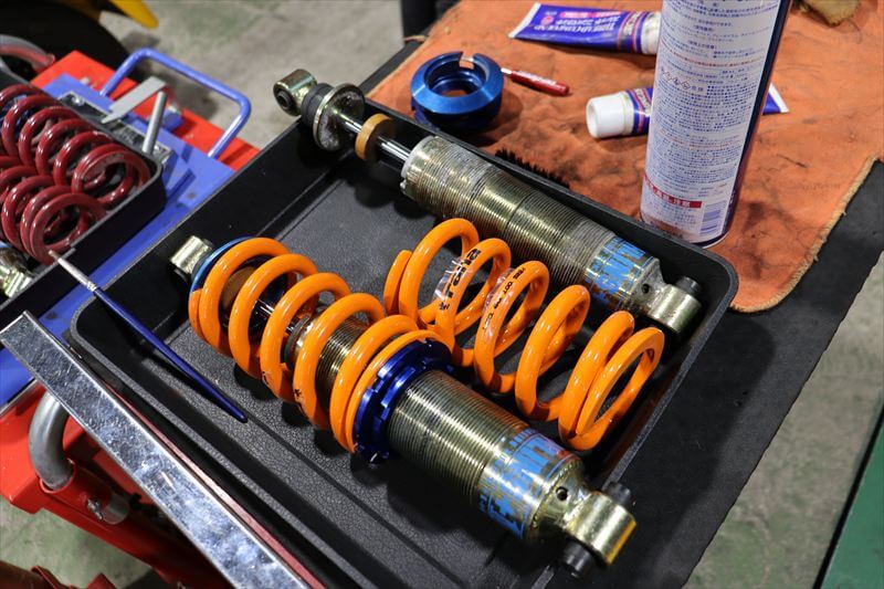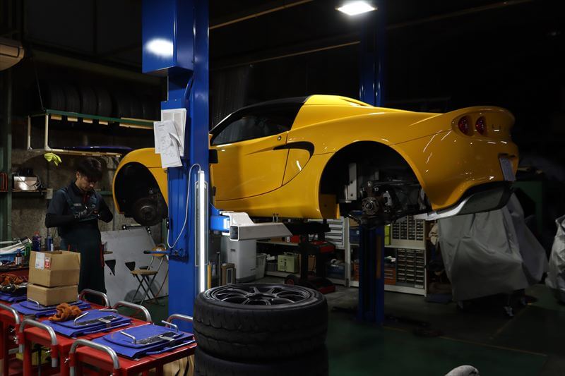 オーナー様はELISEを購入以来、着実にモディファイを進め、趣味のサーキット走行寄りの車両に仕上げて参りました。この度は更なるタイムアップと好みのハンドリングにする為、スプリングレートの変更とアライメント調整を行います。装着されていたサスペンションの特性を損なわない程度のバネレート変更ですが、走りはガラッと変わってくれるはずです。