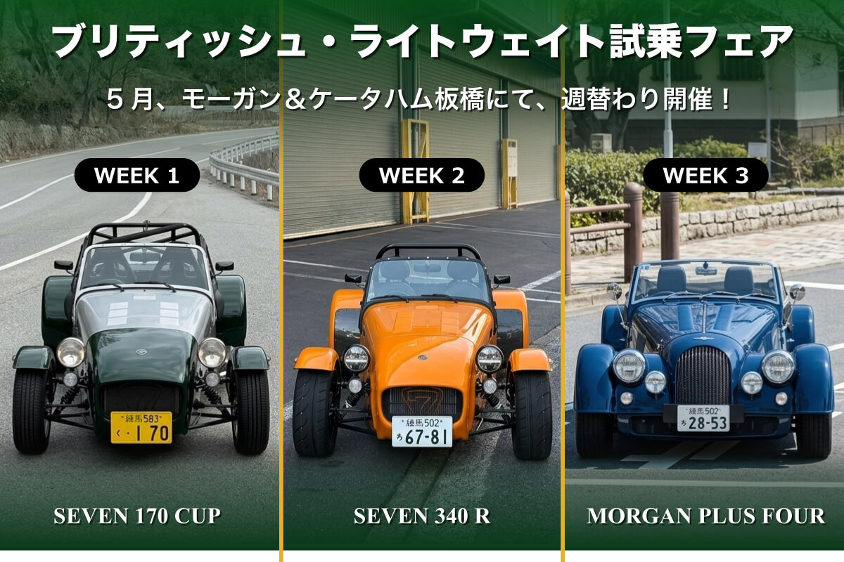 5月の週末、モーガン&ケータハム板橋にて週替わりの特別試乗会を開催いたします。