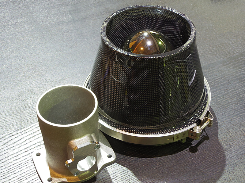 ノーマルのエアクリーナーボックスをごっそり取り外して、カーボン製のエアクリーナーカバー付きのフィルターと交換するのですが、このエアクリーナーカバーがエンジンルーム内の熱い空気の流入を最小限に抑え、冷たい外気だけを効率よく吸入することによりパワーダウンを防止します。またフィルターには湿式タイプを採用しているため集塵能力が高く、専用のクリーナーとオイルによってフィルターを繰り返し使用することも出来るため、とても経済的なんです(^_^)