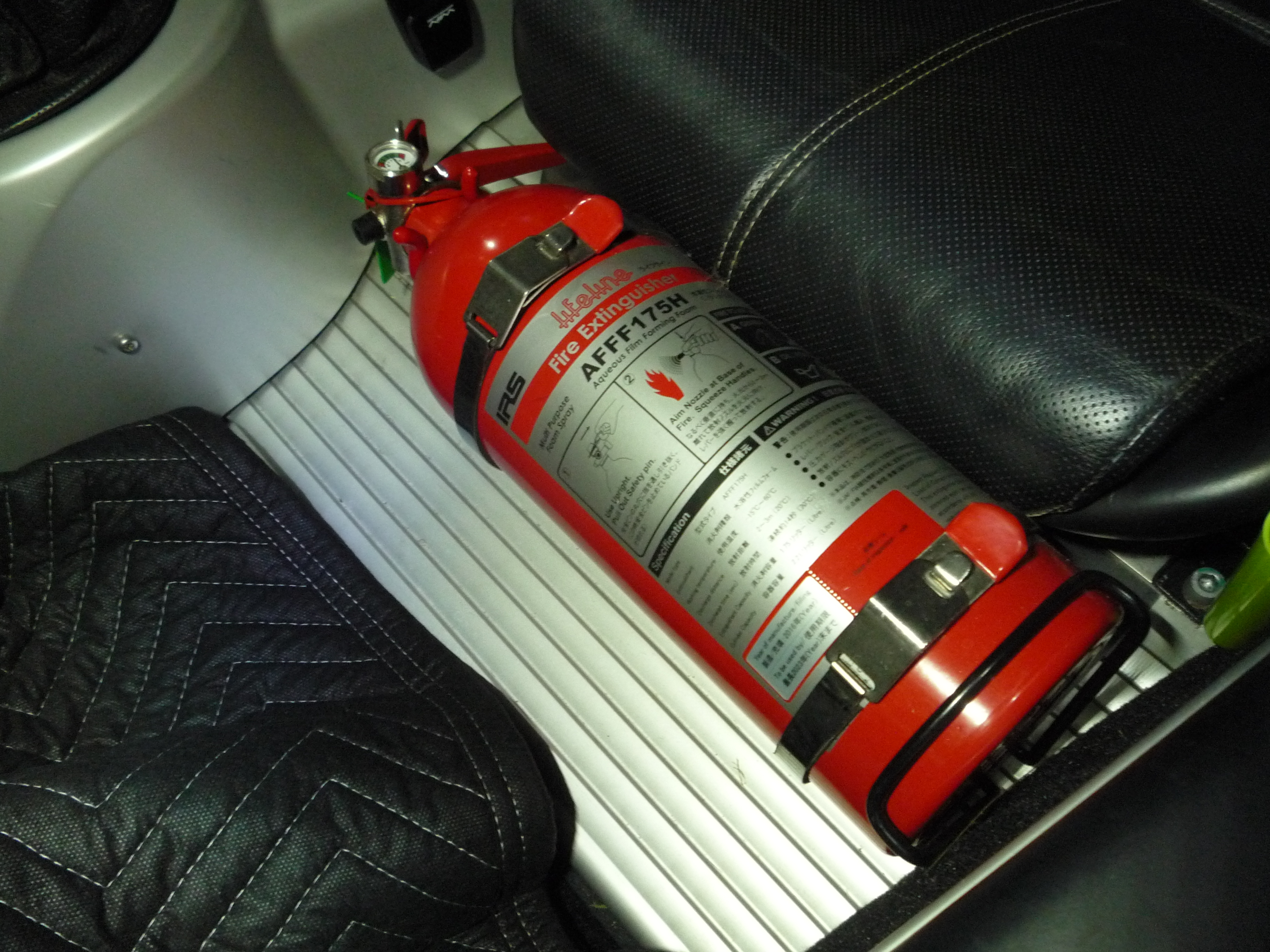 そしてもう一つはこちらの消火器です。言うまでも無く万が一の車両火災に備えて車内に装備しておくもので、サーキット派のオーナー様はもう既に装備されている方も多いかと思います。
