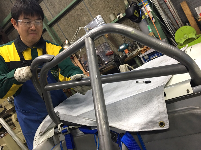 こまかい調整は車体にロールバーを取り付けながら作業を行います。