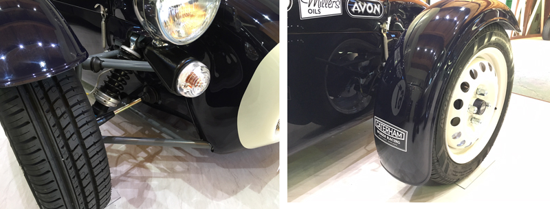 サスペンションアーム、フレーム、ロールバーは現行車はブラックですが、LOTUS SEVENのようにグレーに塗装されています。フロントのウィング(フェンダー)も実はクラシックなSuper Sprintオリジナル品であり、通常のウィングよりも長く作られているんです。