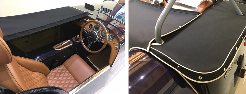 写真では分かりにくい部分ですが、実はトノカバーやトランクフードがモヘヤ地(キャンバス地)となっていて、さりげなく高級感を感じさせるのに役立っています。ここで上げたの箇所はほんの一部分ですので、ファクトリーメイドのクラシックレーサーSuper Sprintを是非実車を見てご確認ください。