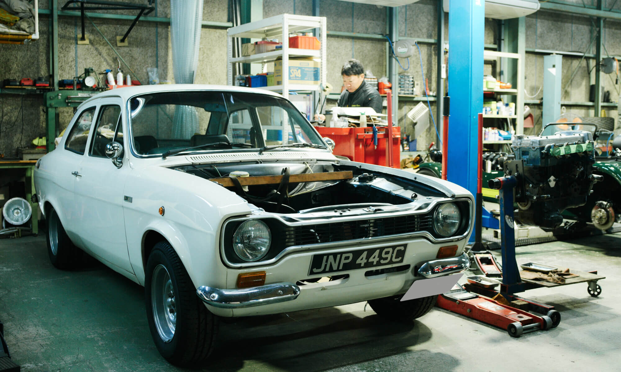 このホワイトのESCORTはLOTUS製のTWIN CAMエンジンを搭載したホットモデル。かつてはサーキットやラリーで数多く使用されていました。