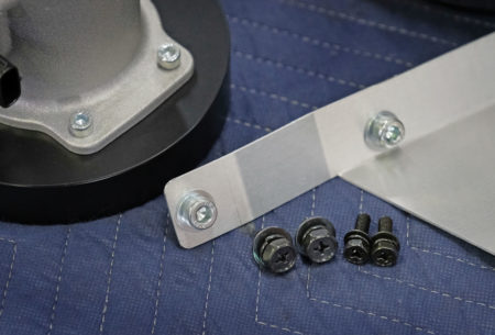レーシングスクリーンの中央の固定にはトノカバーのボタンを取り付けているボルトを利用するのですが、そのままではスカットルとスクリーンの間にはすき間が出来るため、ここを埋めるスペーサーをアルミで製作しました。