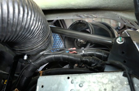 手前の蛇腹が導風ダクト、奥がエアクリーナーです。公道走行用セッティングでは、ダクト開口部とエアクリーナー開口部をずらすことで、雨天時に水を吸い込んでしまうことを防ぎます。サーキット走行ではダクトをエアクリーナーに向けることで、フレッシュエアをダイレクトに吸入させることが可能です。