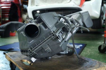 こちらが純正のエアクリーナーボックス。吸気音を抑えるためもあり複雑な形状でかなりボリュームのあるサイズです。樹脂製ではありますが2.5kgほどの重量があります。