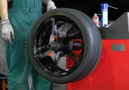 ホイール単体でバランサーに装着してチェックし、一番重いポイントをマーキングします。