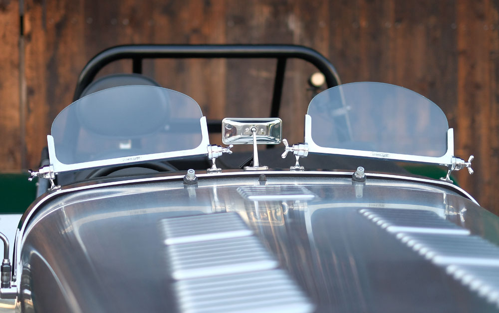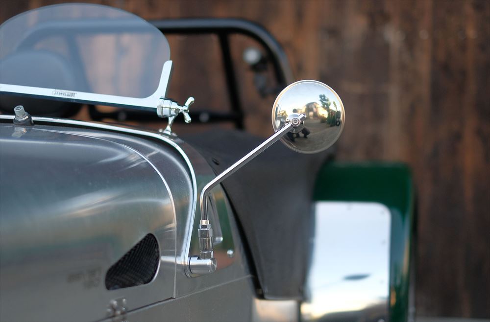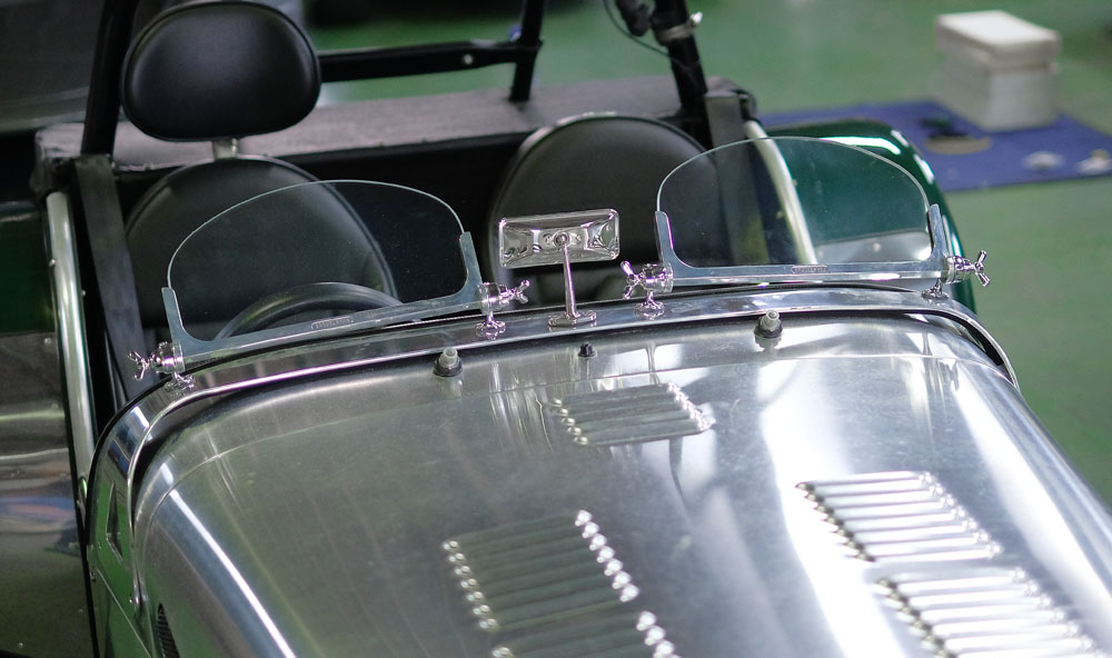 今回はノーマルのウィンドスクリーンに戻しやすいよう、ワイパーモーターはそのままにしていますが、軽さを求める方はモーターを外せば更に数kg軽くなります。センターミラーはSeven Super Sprintと同じ、小ぶりのメッキタイプです。