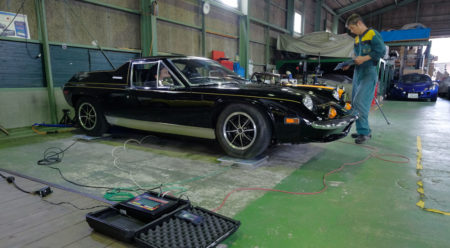 納車を間近に控え、作業も大詰めのLOTUS EUROPAをコーナーウェイトゲージに載せて計測を行います。