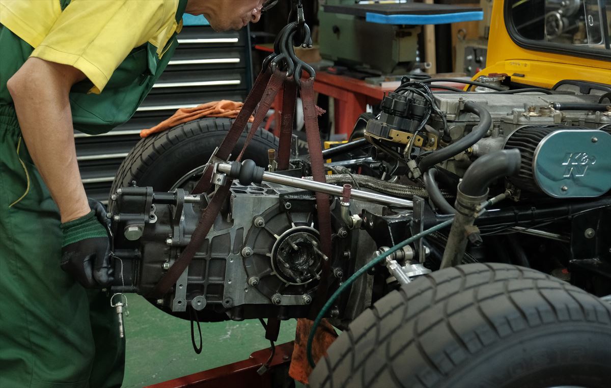 製作したドゥエルピンを組み付け、トランスミッションを車体に搭載すると、ズレなくピタリと収まりました。