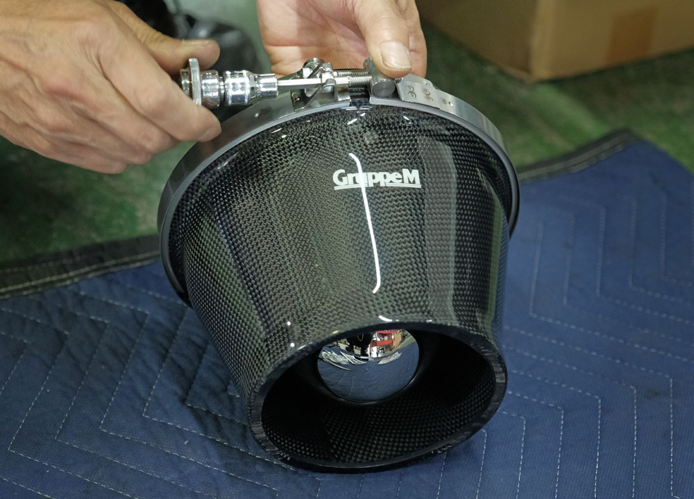 新しいエアクリーナー本体は体積でいえば純正の3分の1くらいのサイズ。カーボンのカバーがエンジンルーム内の熱い空気の流入を抑え、冷えた外気を効率よく吸い込むことでパワーダウンを抑えることが出来ます。