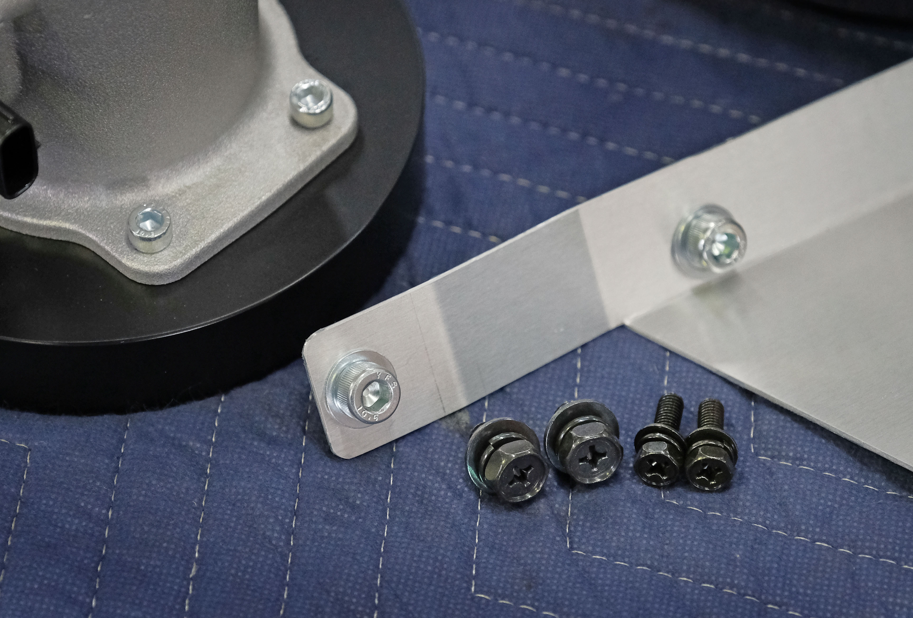 この車両にはバッテリーカットオフスイッチが装着されており、そのガードの取り付けに一工夫必要です。スペーサーを製作して浮かせる方法も考えましたが、ボディとのすき間が大きくなってしまうため、スクリーンを避けるようにガード本体を加工して取り付けました。