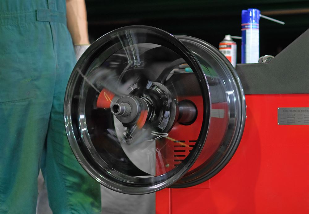 ホイール単体でバランサーに装着してチェックし、一番重いポイントをマーキングします。