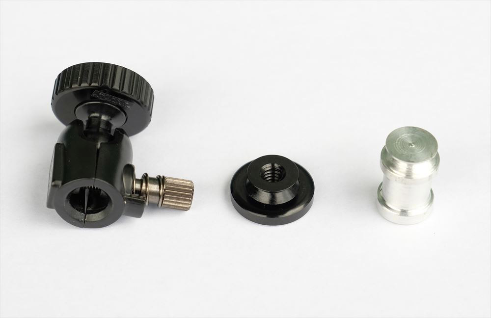 写真中央の黒い部品が自由雲台のベースで、固定用にインチ規格のネジが切られています。今回の用途には高さが足らないため、自由雲台のベースの代わりとなるスペーサーを兼ねた支柱を旋盤で製作いたしました。固定用のネジも一般的なミリサイズとしています。