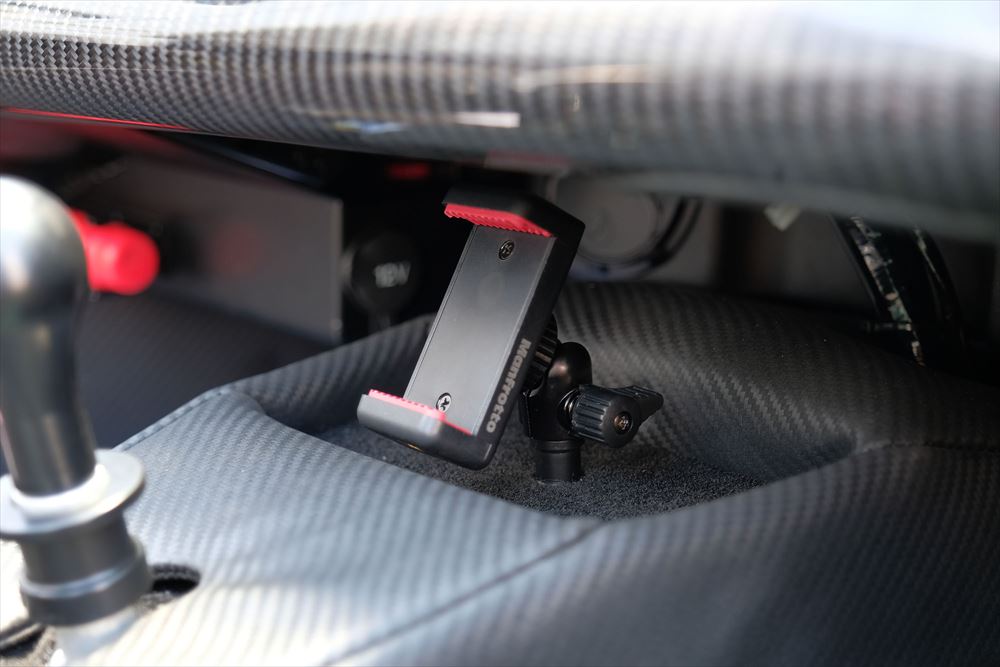 運転席に座るとこのように見えます。スマートフォンを取り付けるとクランプもほとんど目立たず、シンプルなコックピットの雰囲気を壊しません。