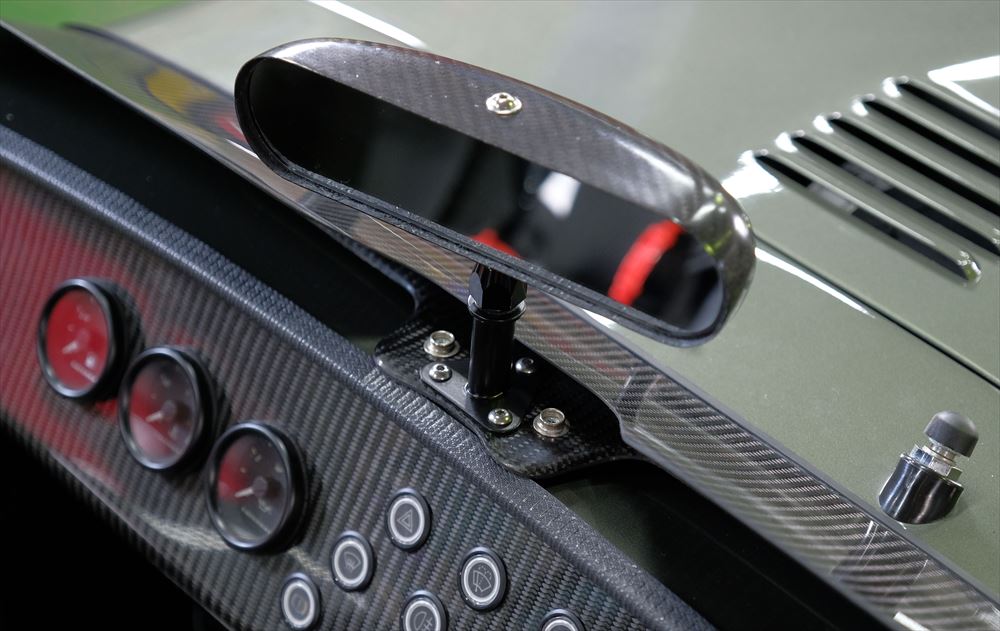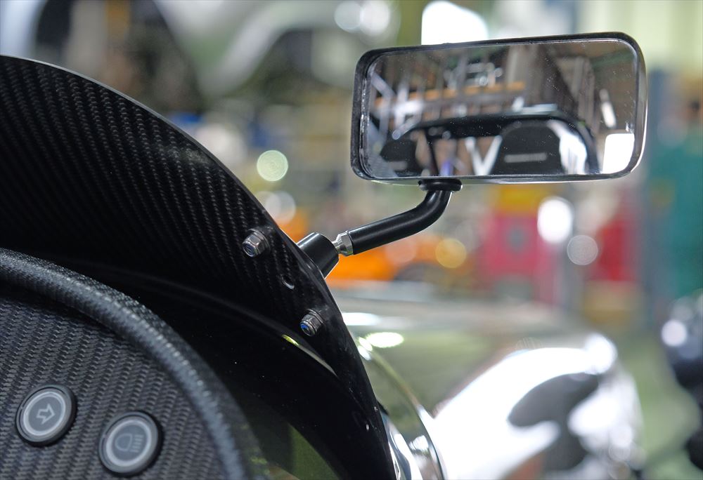 今回はノーマルのウィンドスクリーンに戻しやすいよう、ワイパーモーターはそのままにしていますが、軽さを求める方はモーターを外せば更に数kg軽くなります。センターミラーはSeven Super Sprintと同じ、小ぶりのメッキタイプです。