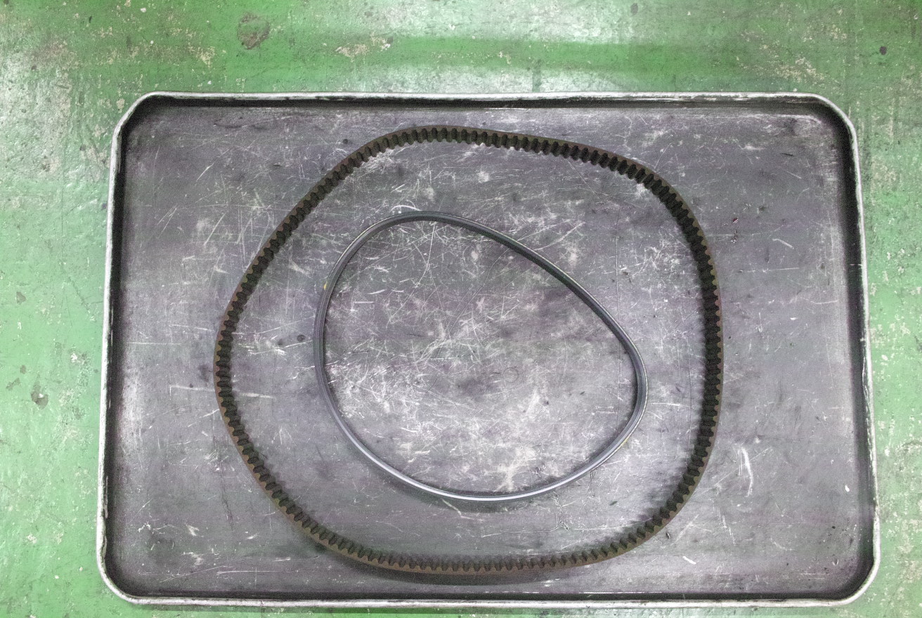 距離だけを見れば4万キロそこそこなのでまだ距離を伸ばせるかと思いましたが、ベルトを外してみると綺麗な円ではなく多角形のようになっています。しばらく走らずにいると、プーリーに掛かっている部分にクセがついてしまい、この部分からひび割れなどのダメージに繋がることになります。内側にあるのがオルタネーターベルトです。こちらもクセが付いてしまっているので交換しておきましょう。