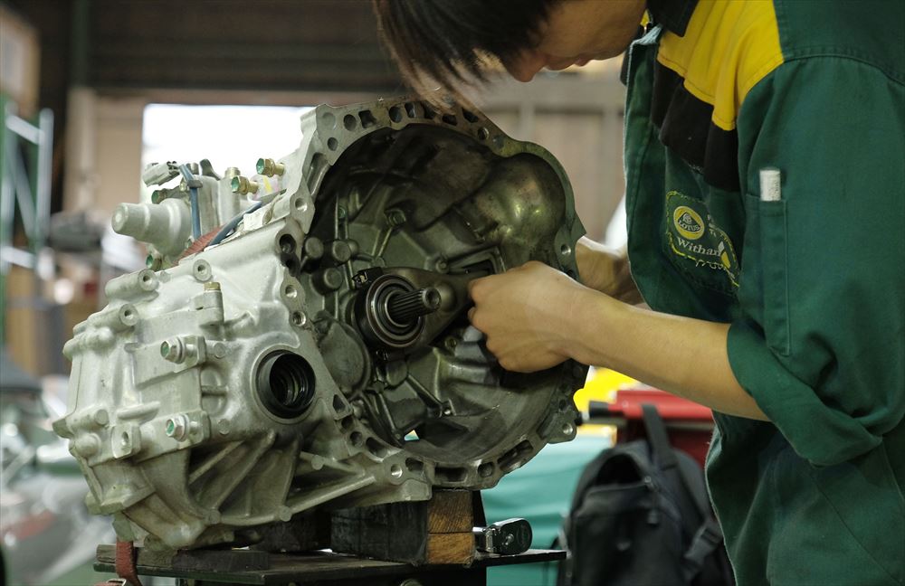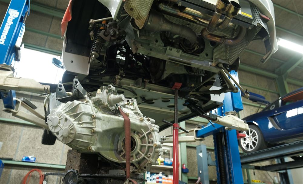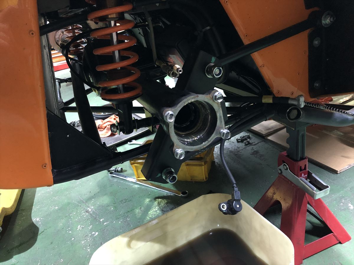 ホーシングを取り外すため、まずブレーキ周りを分解してドライブシャフトの取外しです。車両重量が軽するためにシンプルな構造になっており、スムーズに脱着作業が進みます。