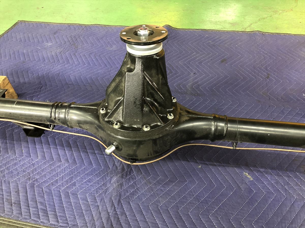 プロペラシャフトのフランジを切り離し、アッパーアーム、ロアアーム、ラテラルロッド、サスペンションを取り外すとホーシング単体になりました。