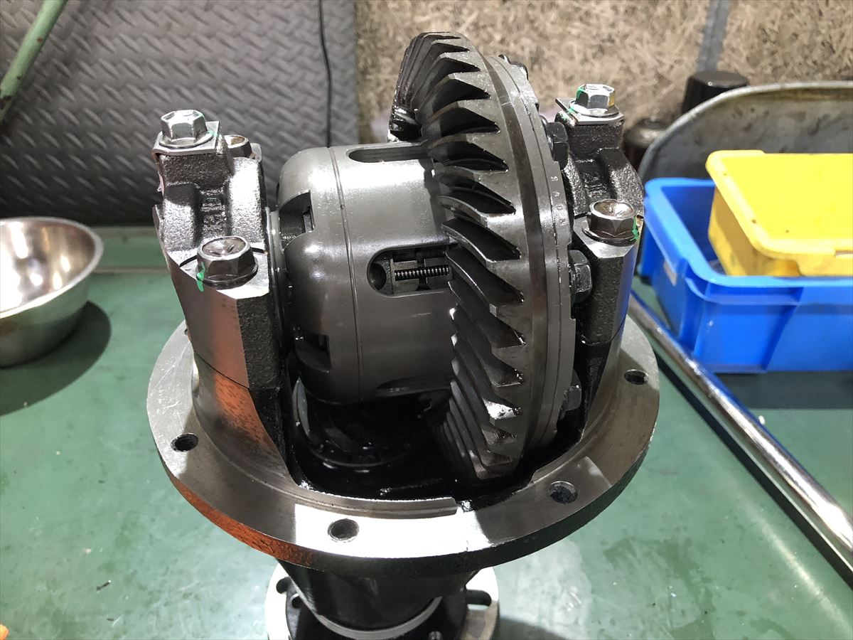 横置きのトランスミッションに組み付けられているデファレンシャルとは違い、このタイプはプリロード・リングギアの歯当たり・ピニオンシャフト・バックラッシュなど、調整箇所が多数あります。各部を慎重に調整して、デファレンシャルへの組み付けました。