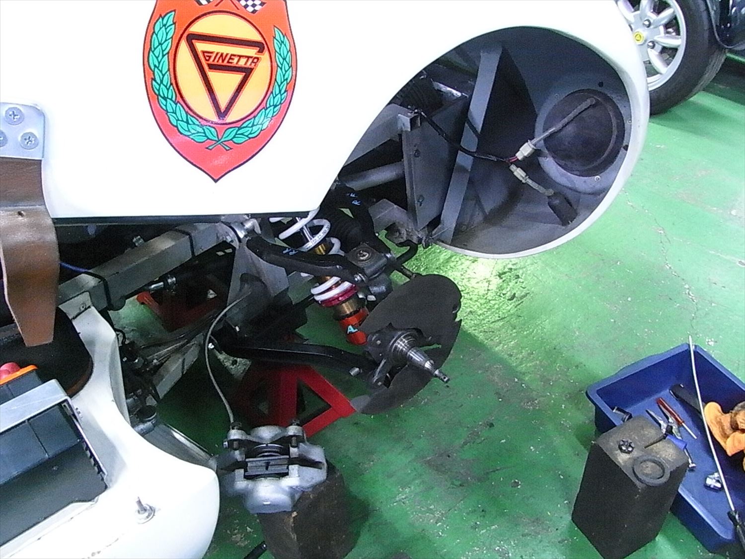 サーキット走行を終えたGINETTA G4のアフターメンテナンスを行います。