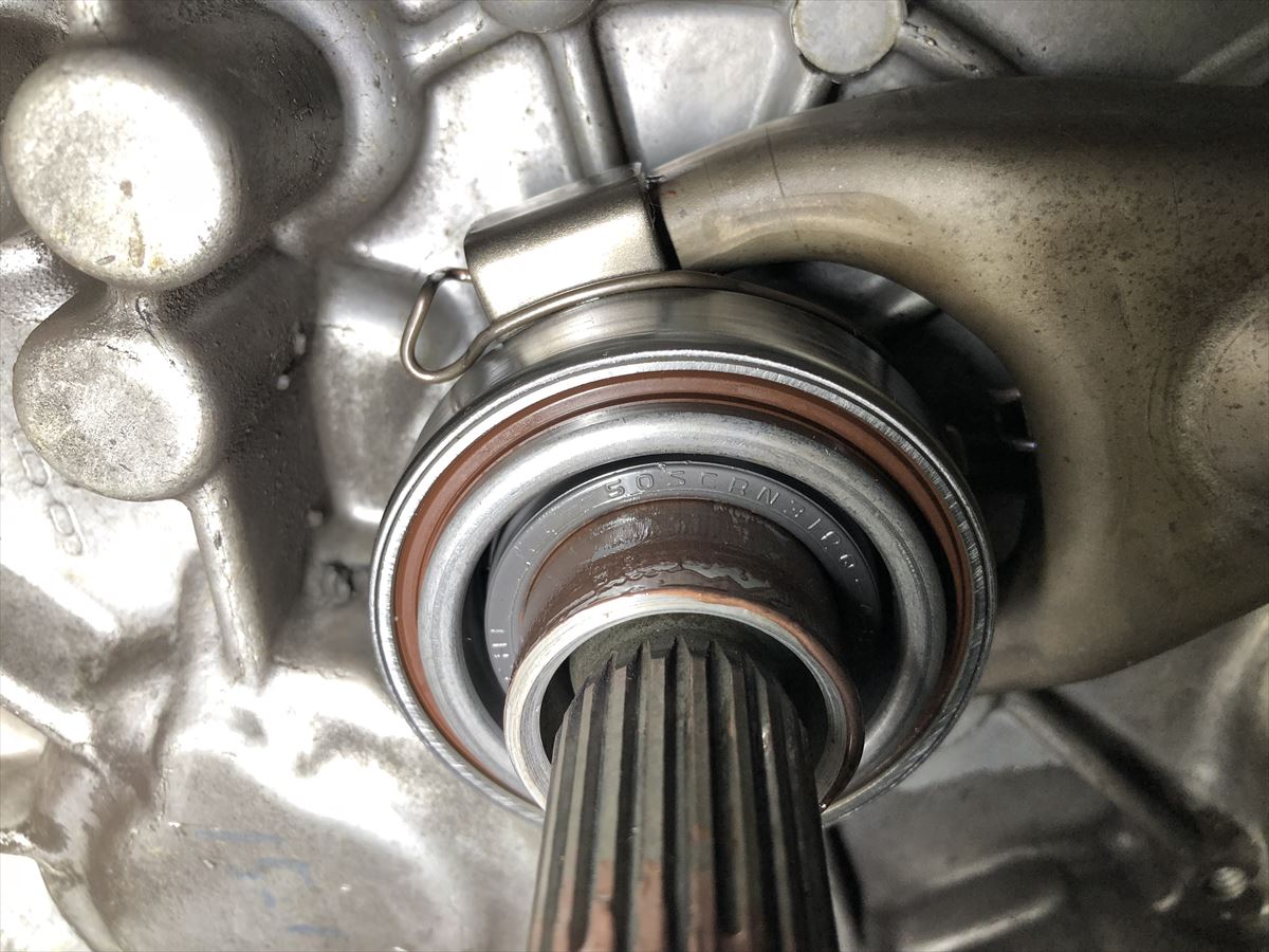 合わせてレリーズベアリングも新品に交換します。ベアリングからはシャラシャラと音が出始めていたので、ちょうど交換時期でした。