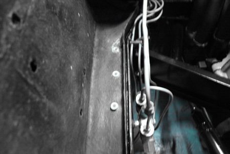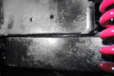 この画像はバッテリー搭載予定箇所をタイヤハウス側からみたものです。上がボディ・下がフレームで、両者の間にすき間があいています。