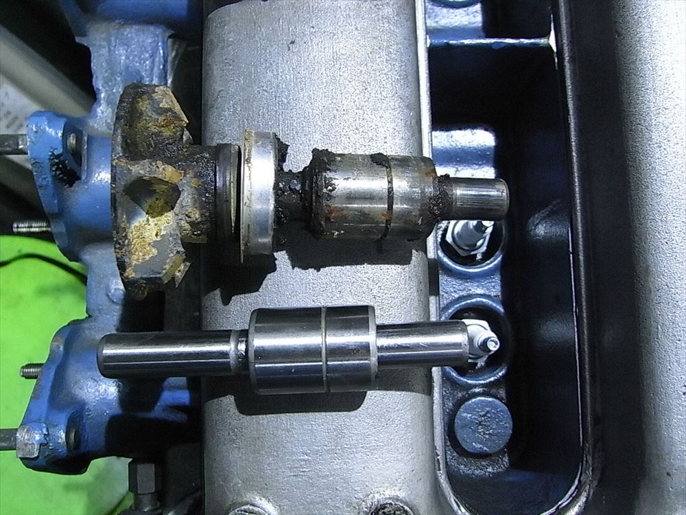このエンジンはしばらく乗らずに放置されていたために、インペラが錆びて、シャフトにもガタが生じ、水漏れが発生している状態でした。
