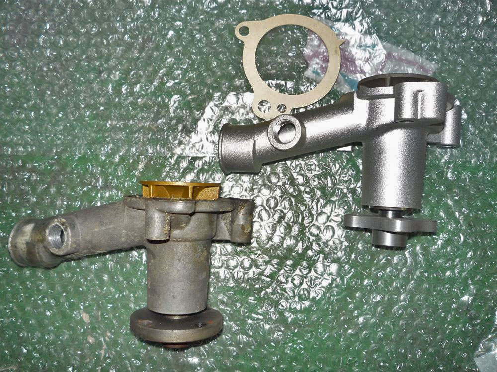 取り外したパーツです。新品はプーリー取付面の形状が少し変更されていますね。真上に向いたネジ穴にはヒーターホースのアダプターが接続されるのですが、古くなってくるとネジがかじってしまい移植できないこともあります。今回は幸いきれい取り外しが出来ましたので、ウェットブラスト加工を施した上で移植しました。