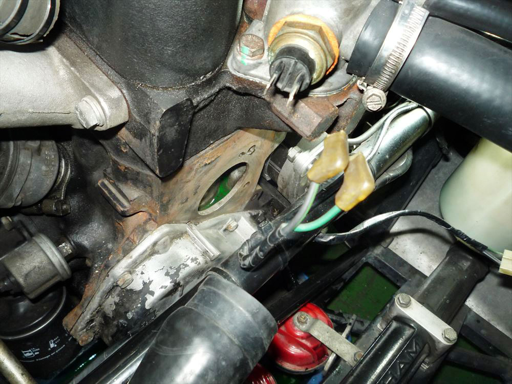 写真の中央、4本のボルトで取り付けられているプーリーの裏にウォーターポンプがあります。