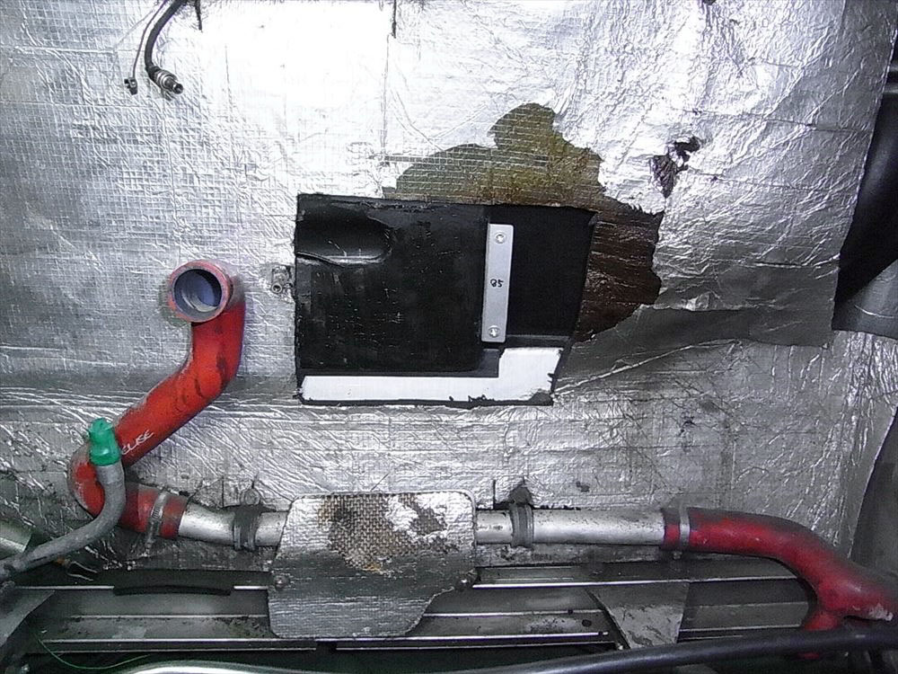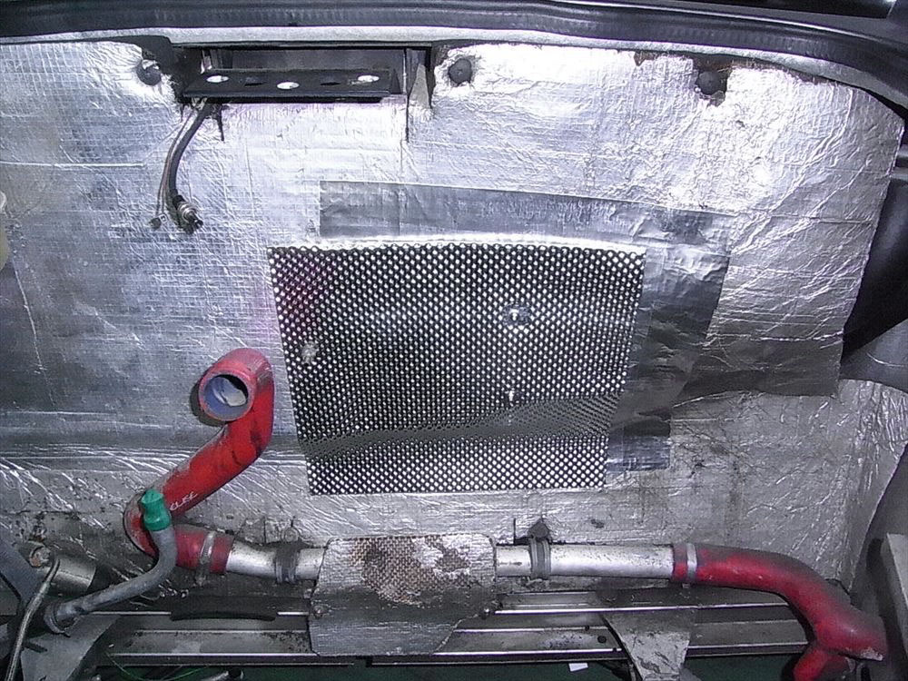バルクヘッドに貼られた断熱材の一部(=四角く切り抜いた部分)が、エキゾーストの熱による影響で、小指で触れただけでカサカサに粉砕してしまうほどに劣化していました。断熱材はアルミシートとスポンジで作られていますから、製造から20年経つと思えば無理もありません。