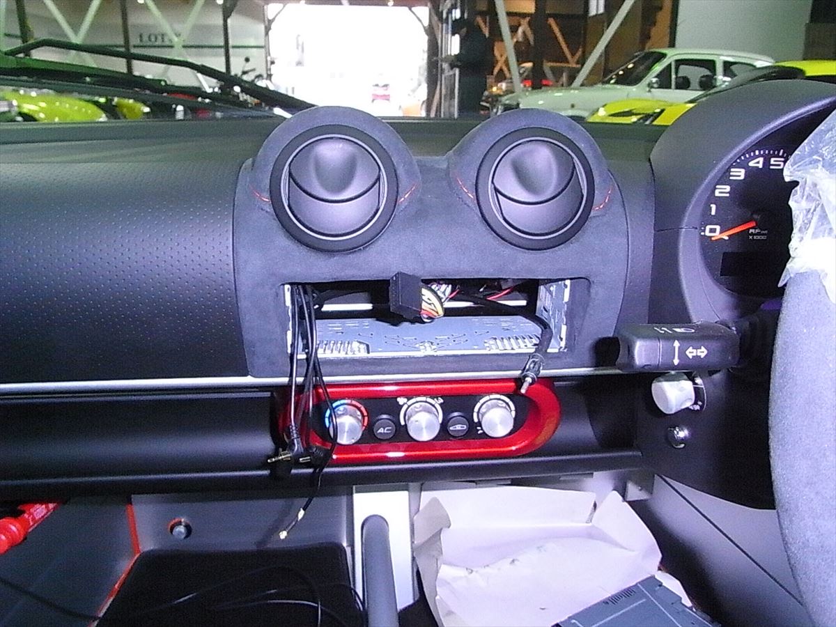 EXIGE CUP 380へバックモニターカメラとナビの取り付けをご依頼頂きました。LOTSUの中でもEXIGE系は後方視界が良くないため、バックカメラは人気のメニューです。