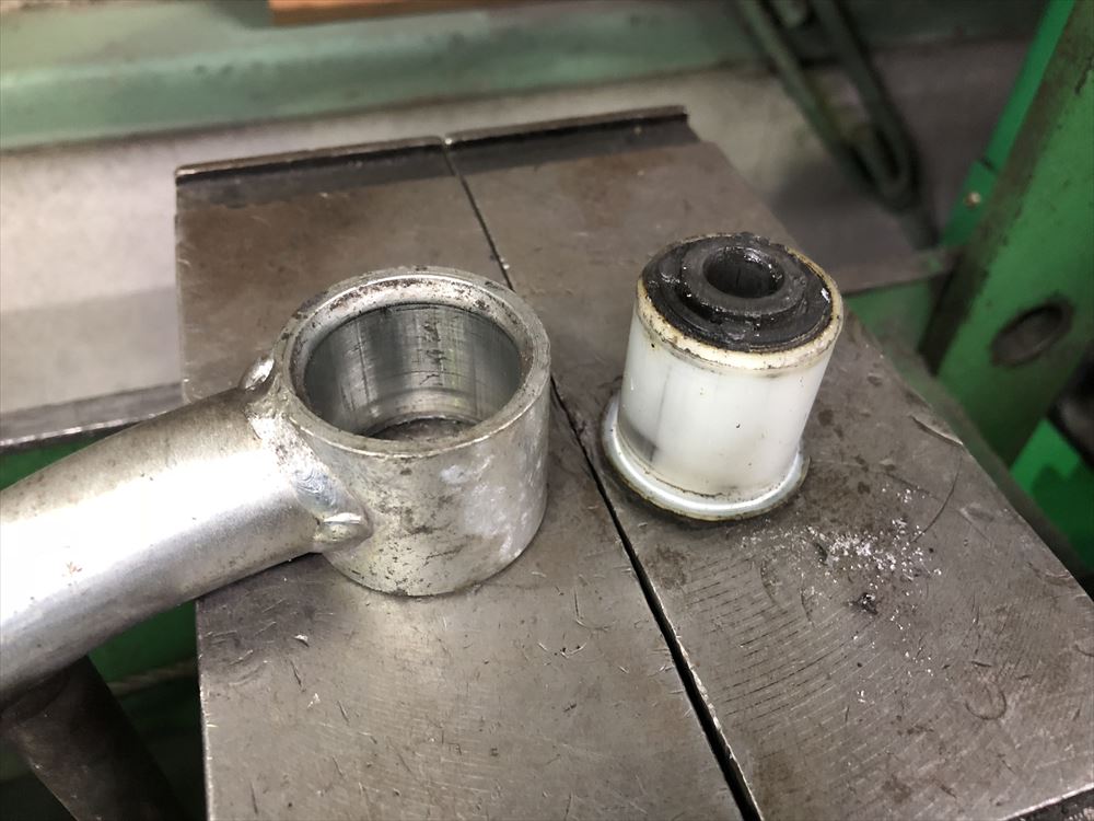 上の画像はサスペンションアームから抜いたブッシュです。ブッシュとスリーブが擦れている跡があるのがご覧いただけますね。圧入されているパーツですから本来ならば動いてはいけないのですが、経年劣化などで動き出してしまうと一気に摩耗が進み、最終的には加速やブレーキングでサスアームが動くようになってしまいます。