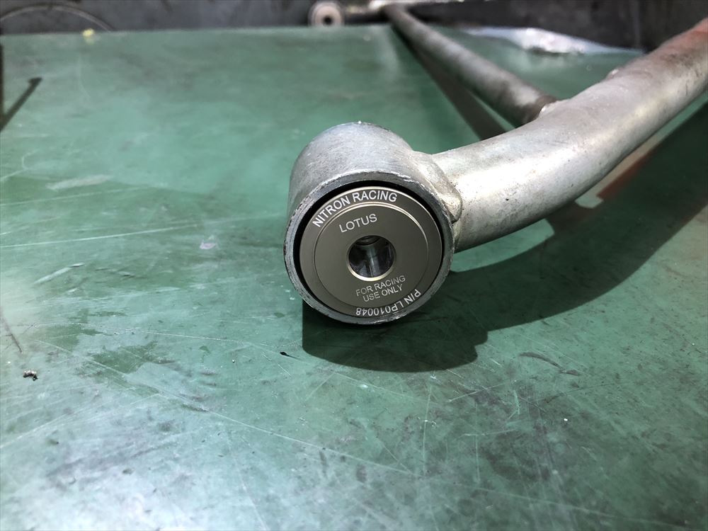 スフェリカルベアリングに打ち替えが完了しました。取り付けてしまうと見えなくなってしまうパーツですが、アルマイトに”LOTUS”の文字がはいったLOTUSロゴが入っていてとてもかっこいいです。作動抵抗が非常に小さくなり、サスペンションアームの動きがゴムブッシュと比較して断然スムーズになります。結果サスペンションユニット動きをブッシュが阻害せず、性能を余すことなく引き出すことが出来るようになるのです。