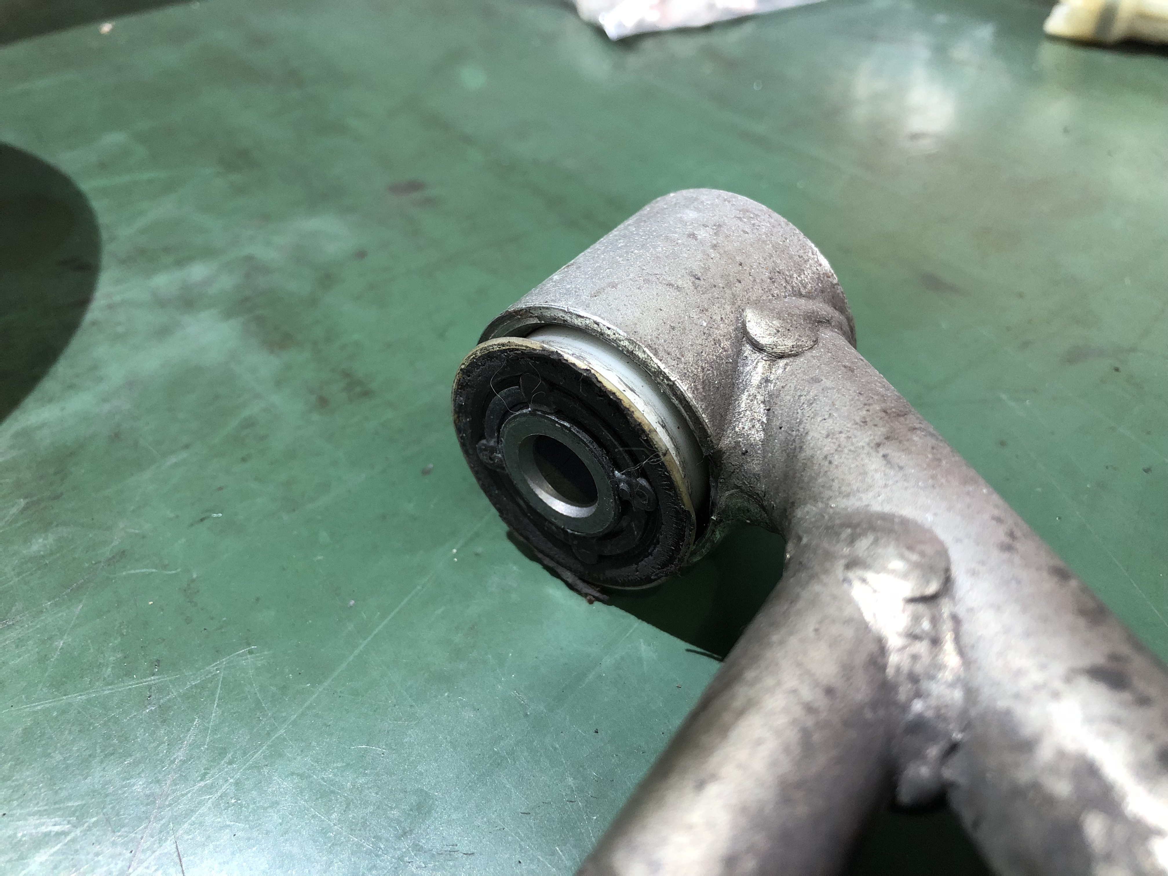 こちらは111CUPに参戦しているお客様の車両のウィッシュボーン。リアのサスペンションブッシュがすぐにヘタってしまうとのことで、スフェリカルベアリングへの交換をオススメさせていただきました。入庫後早速リアのサスアームを取り外してみると、指で押すと抜けてしまうほどブッシュの摩耗が進んでいました。