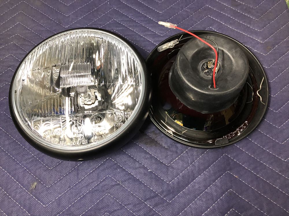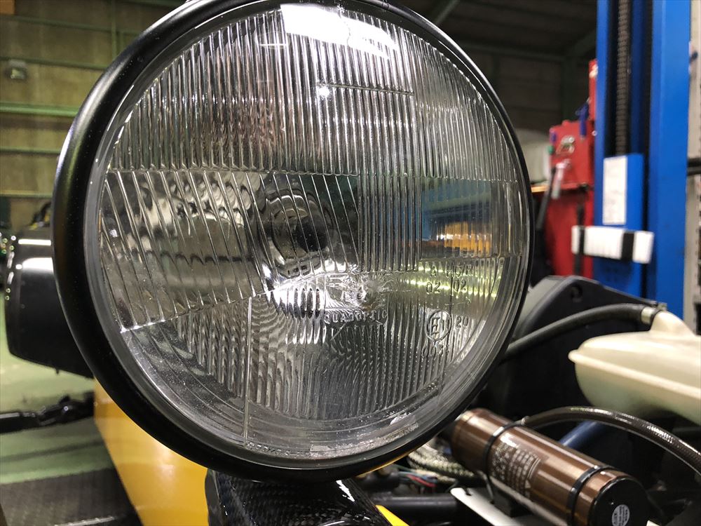 さて、今回ご入庫の車両はローバーエンジン世代のR500。この頃は7インチが装着されています。ヘッドライトに飛び石があたり、レンズ部分が割れてしまったため、英国WIPACの新品レンズに交換させていただきました。