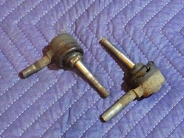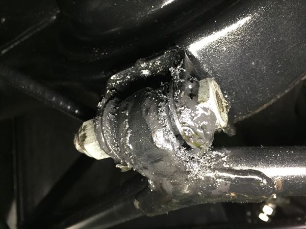 こちらはリアサスのトーリンクロッドのボールジョイントです。ゴム製のダストカバーに亀裂が発生し、グリスが漏れてしまっていました。スムーズに動かない状態でしたので、すべて交換です。