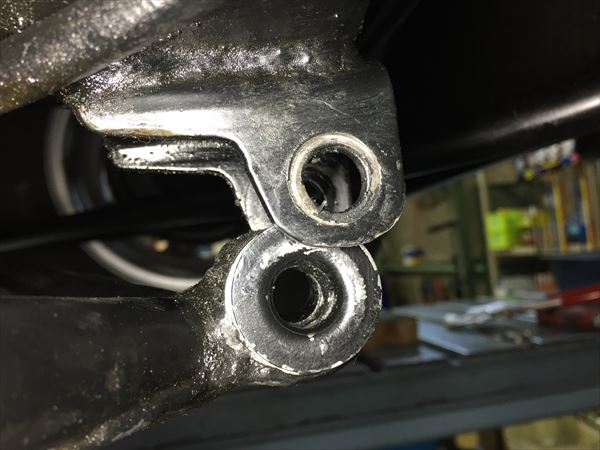 加速やブレーキング時にカツカツとやや大きめの金属音が聞こえましたので、早速点検してみると、Aアームのブッシュが完全に摩耗してしまい、アームとアクスルの間に大きな隙間ができていました。こうなるとブッシュの交換が必要です。