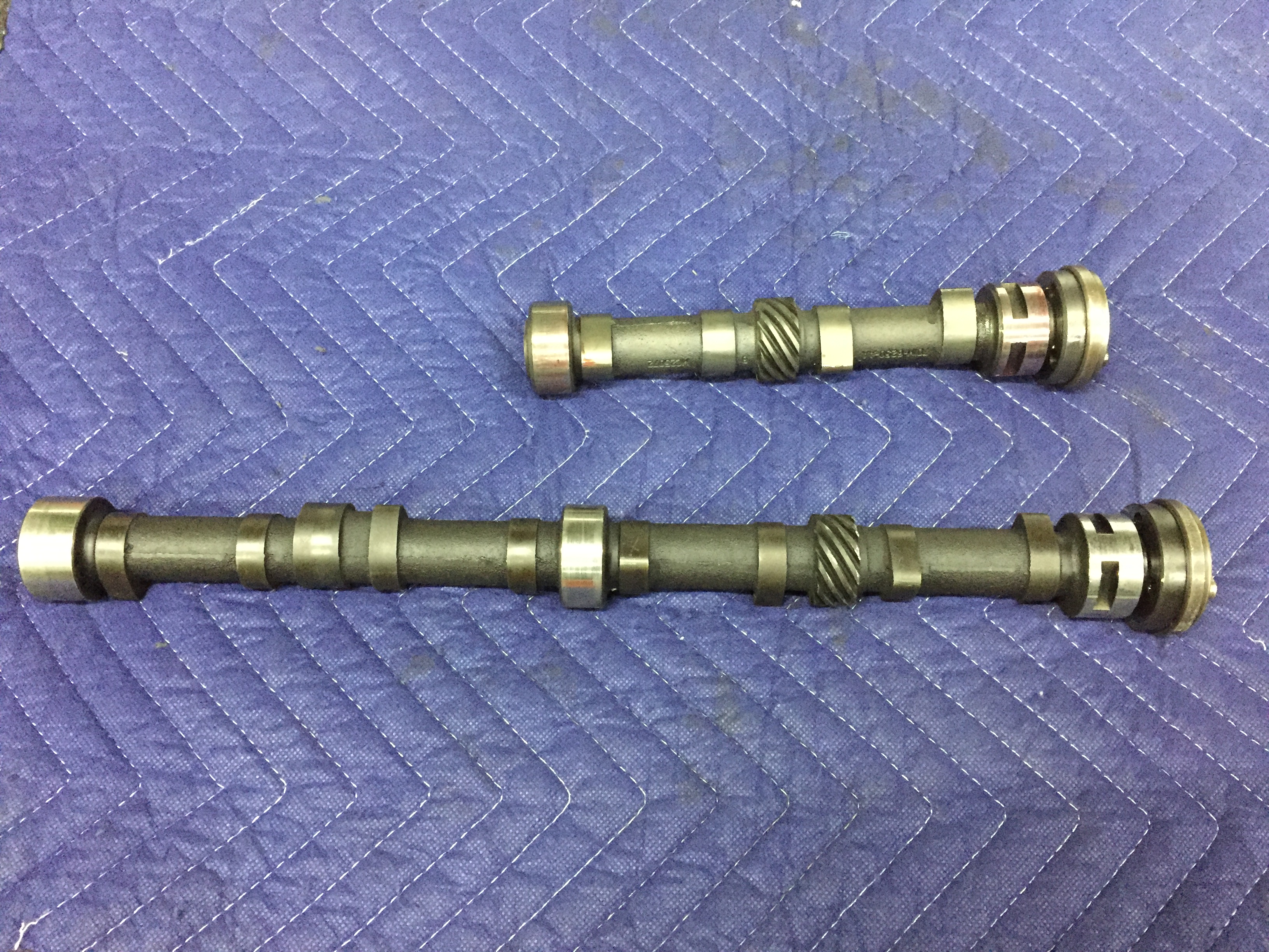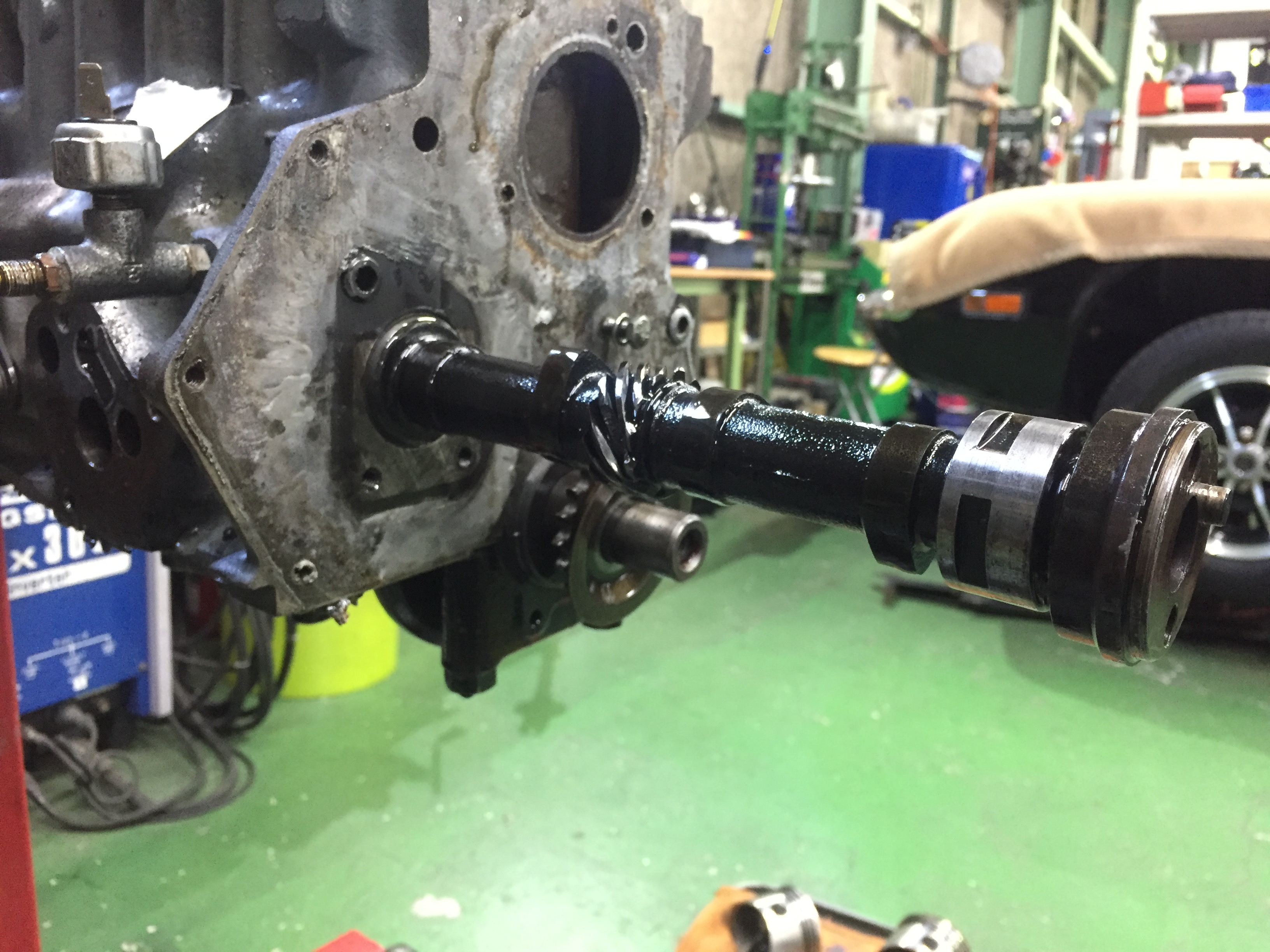下が取外したシャフト、上が今回取り付けるシャフトです。OHVからDOHCに動弁機構が変更されているため、このカムシャフトにはバルブを開閉させる役目は無く、デスビやオイルポンプを駆動させるためだけに存在しています。ですので新しいシャフトでは、フリクションロスを減らすため必要のない部分は切断してあります。さらに徹底させて、シャフトにあるカム山も削り落としてしまう場合もありますが、今回はカム山の加工までは行っていません。