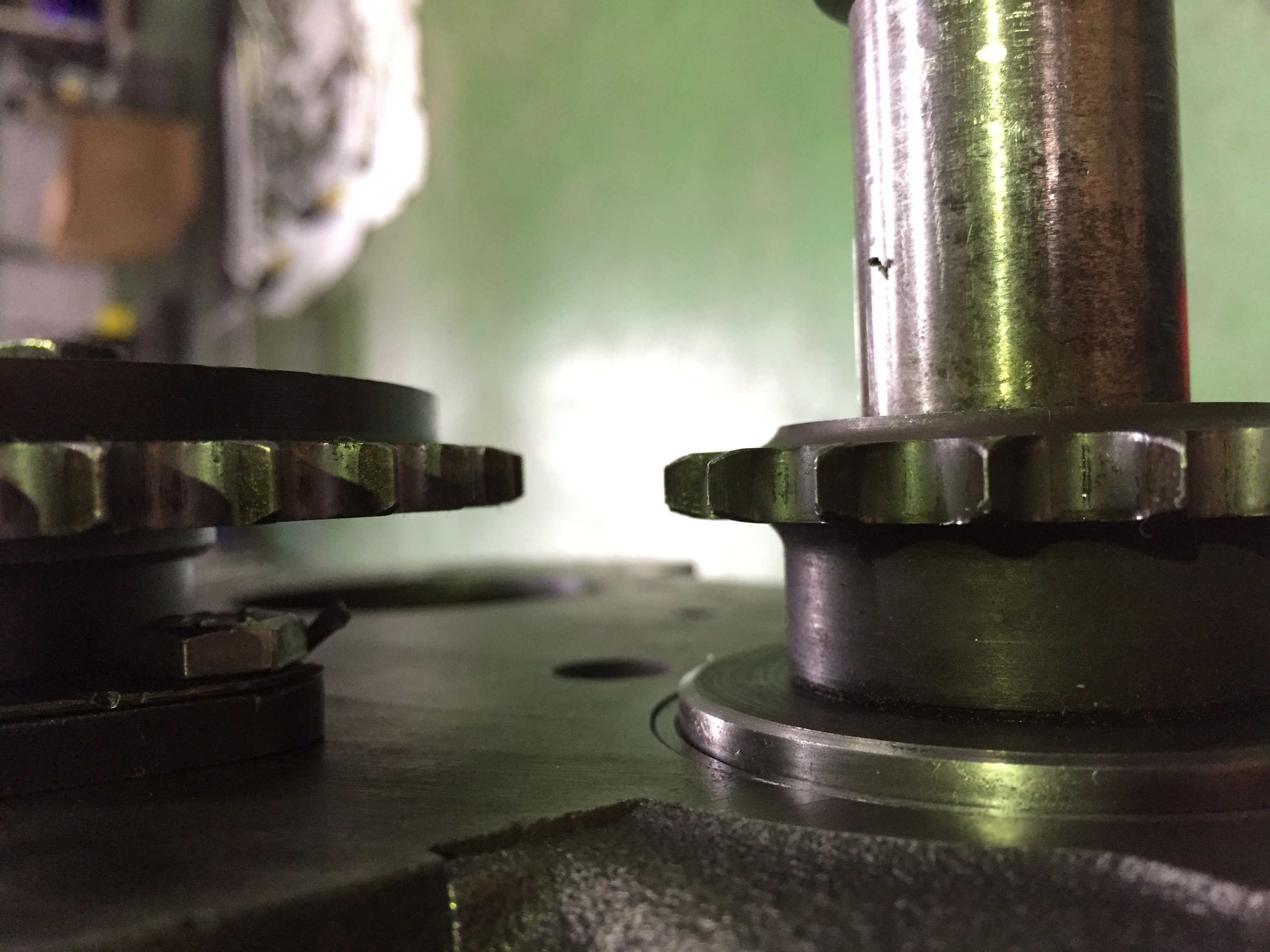 シャフトのメタルも新品に打ち替えて取り付けました。スラスト方向のクリアランスの測定を行い、問題がないようなのでスプロケットも取り付けます。