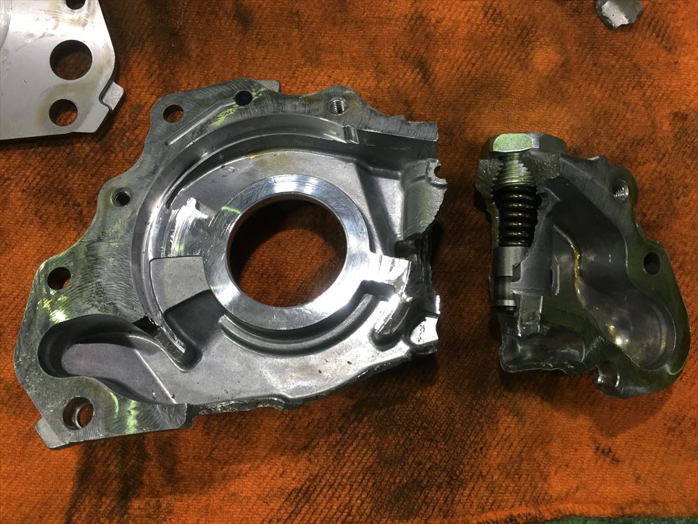 オイルポンプを分解してみたところ、ポンプ内部のアウターリングが破損して、ハウジングを割ってしまったようです。