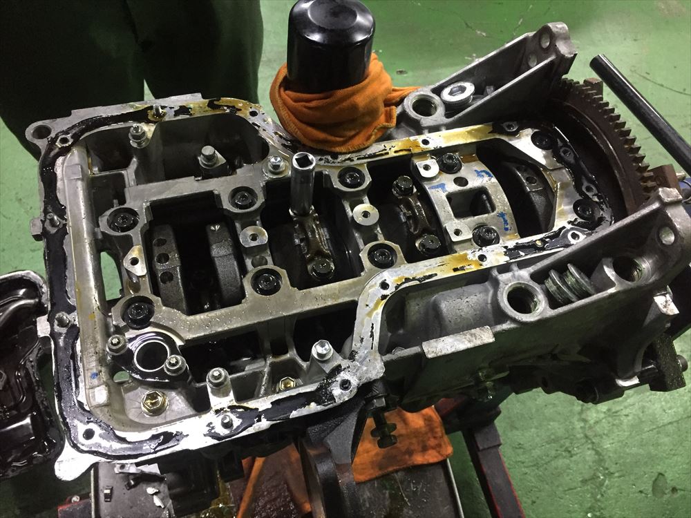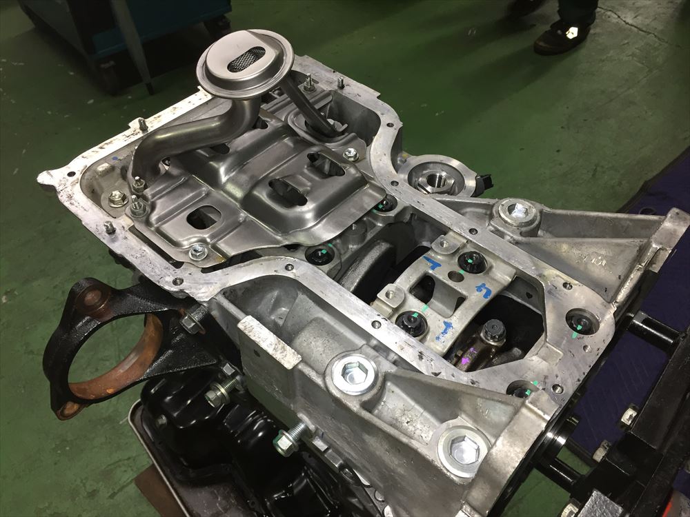 全ての調整が完了したら、オイルストレーナなどの補機類を取り付けて、オイルパンを貼り合わせます。次回からはオイルポンプの交換とヘッドの組付けを紹介していこうと思います。